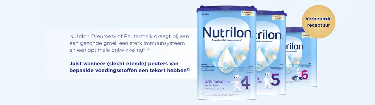 De verbeterde receptuur van Nutrilon Dreumes- en Peutermelk is speciaal ontwikkeld om aan deze specifieke behoeften te voldoen.