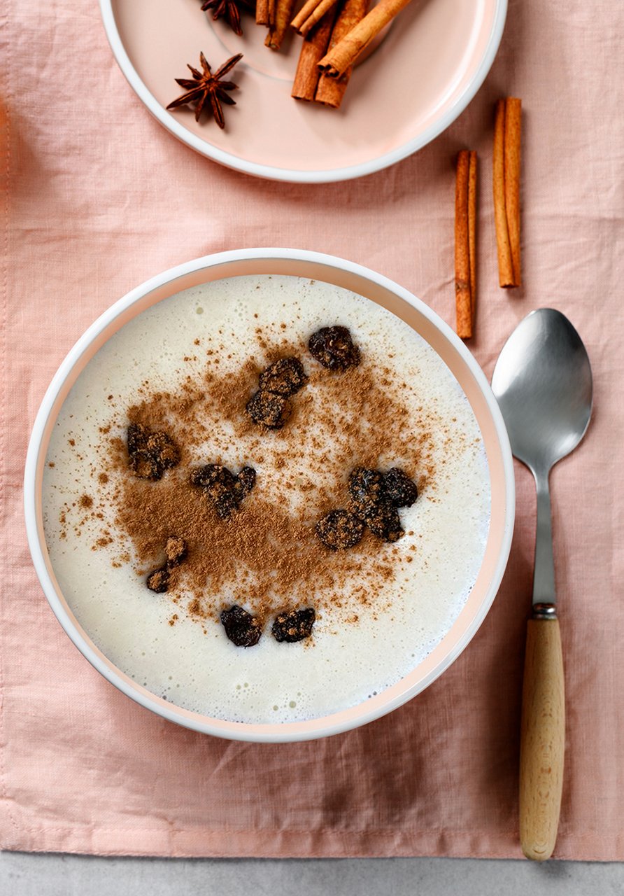 - Verdeel de rijstpudding over een kom en decoreer naar wens met kaneel en rozijnen.