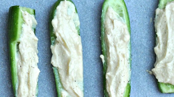 5. Besmeer de komkommers met het humus mengsel en leg ze in een ovenschaal of op een met bakpapier beklede bakplaat.