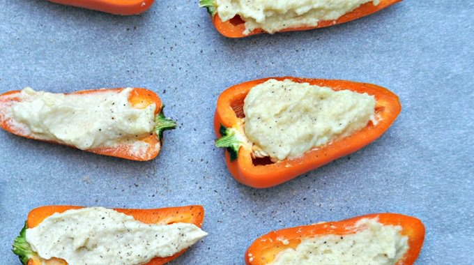 5. Besmeer de minipaprika’s met humus en leg ze in een ovenschaal of op een met bakpapier beklede bakplaat.
